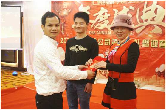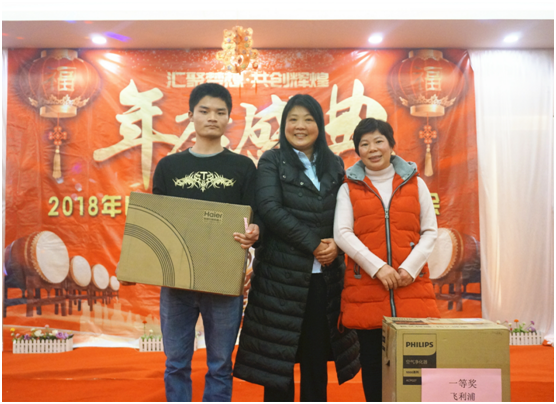 隨后主持人宣讀了獲得2017年度優秀員工榮譽稱號的各部門獲獎名單,并對其進行了表彰頒獎,號召大家向優秀員工學習。后面晚會節目表演部分在工廠三車間全體員工表演的擒敵拳《龍的傳人》中拉開序幕,隨著各部門精心準備的氣勢恢弘的歌舞表演、幽默滑稽的小品、優雅動聽的歌曲等節目表演和抽獎的穿插進行,整臺晚會高潮迭起,精彩紛呈,為大伙帶來了一道文藝視聽盛宴。